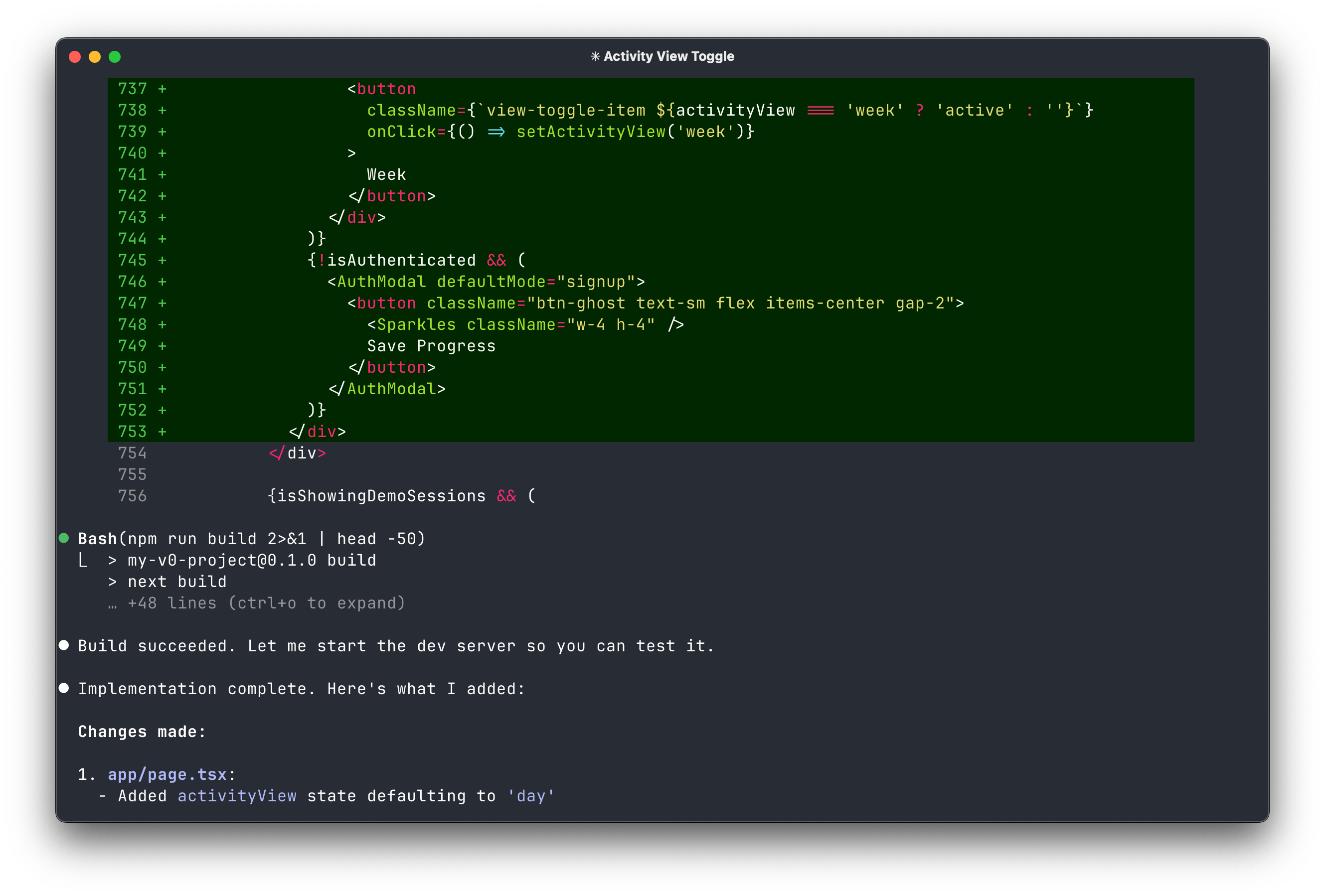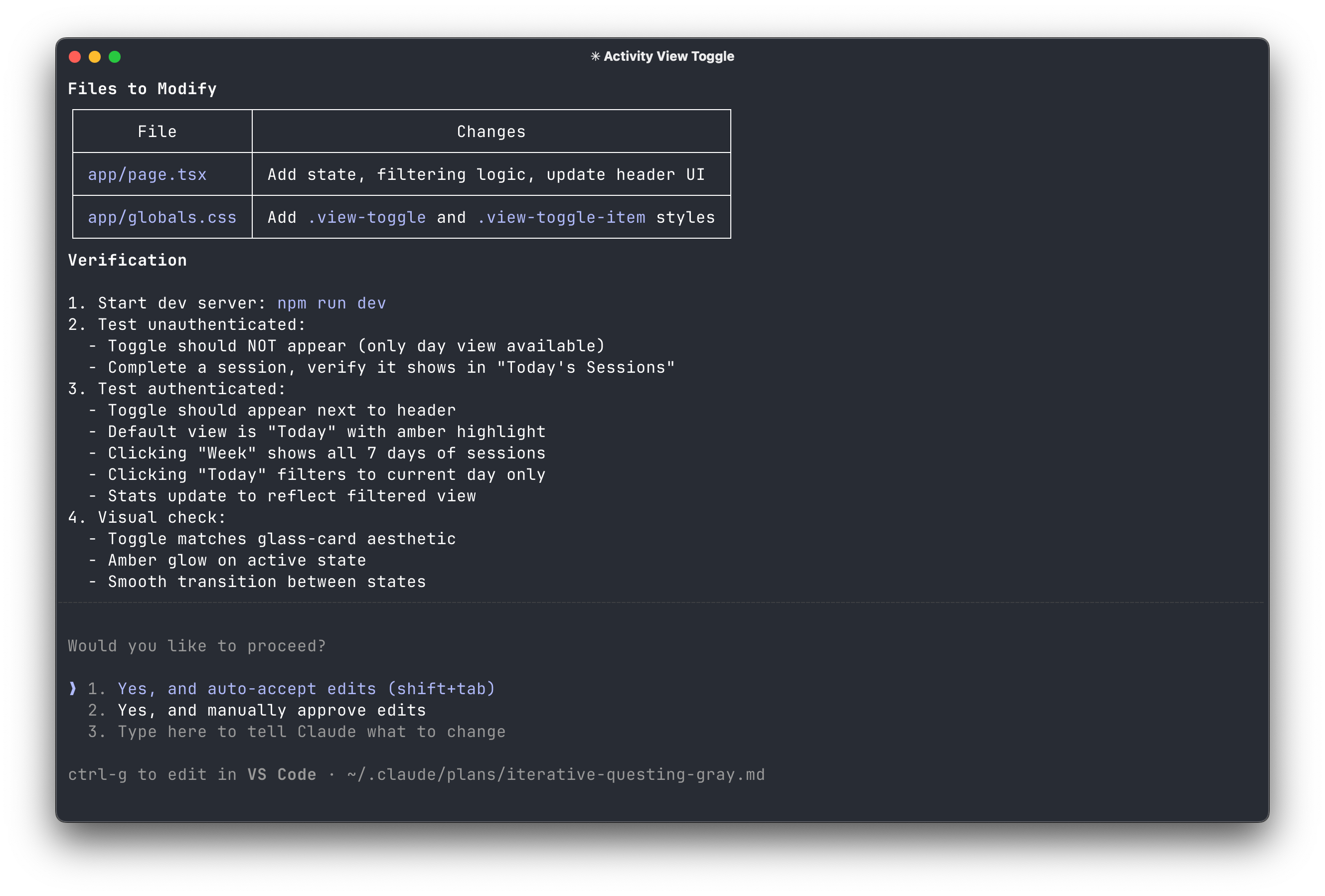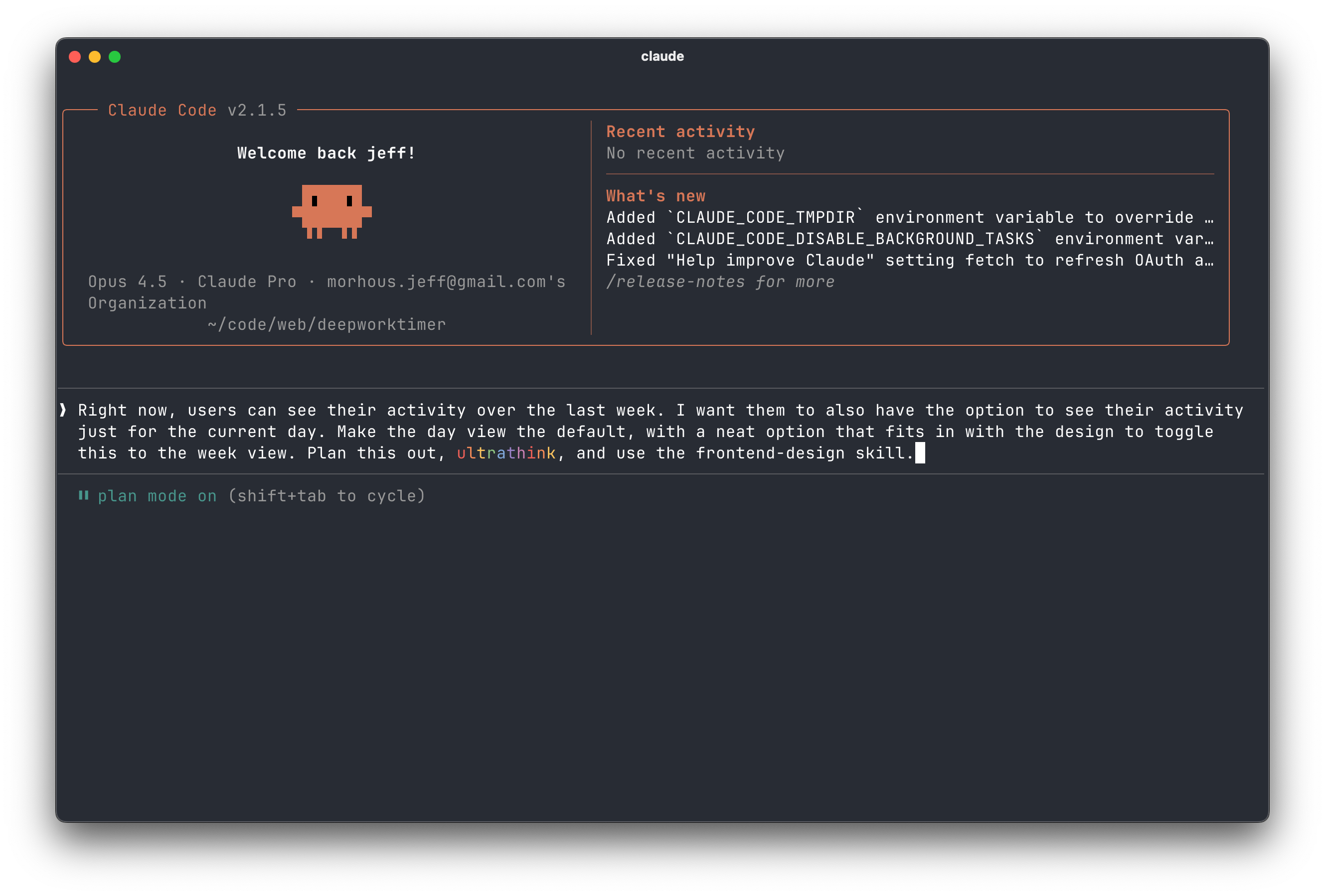 Right now, users can see their activity over the last week. I want them to also have the option to see their activity just for the current day. Make the day view the default, with a neat option that fits in with the design to toggle this to the week view. Plan this out, ultrathink, and use the frontend-design skill.Claude will do some initial reasoning, index your codebase (if it hasn’t already), and then ask some back-and-forth clarifying questions about the feature if anything isn’t clear.