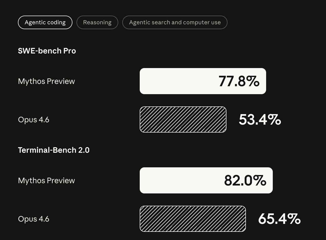 The benchmark numbers are the first reason this matters. Anthropic says Claude Mythos Preview hit 77.8% on SWE-bench Pro, 93.9% on SWE-bench Verified, and 82.0% on Terminal-Bench 2.0.