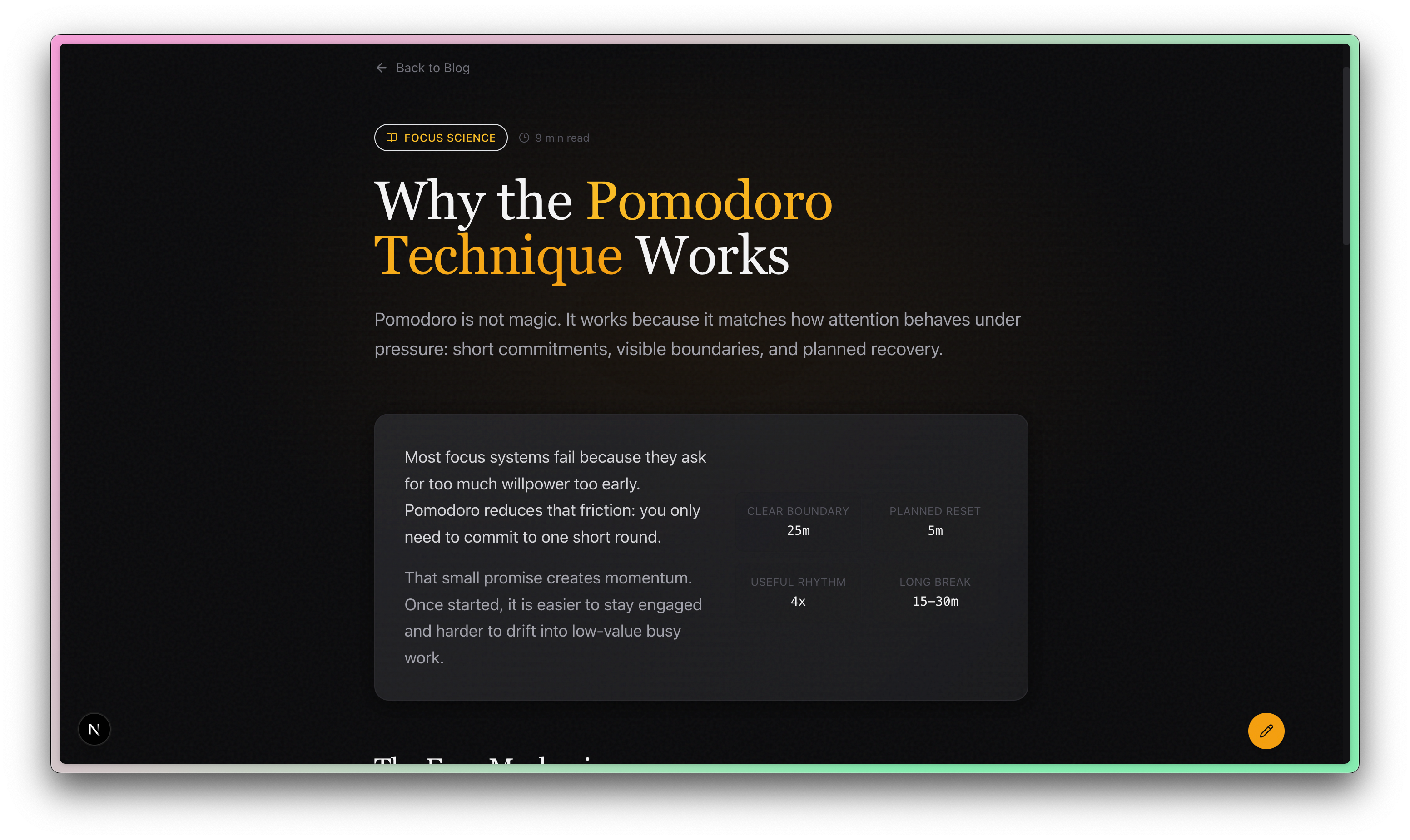 This app has a blog post in app/what-is-deep-work/page.tsx - The blog post is accessible from a link in the question mark box on the home page. Make it so there is a proper "blog" page instead of that link to this blog post in the question mark thing. The blog link should be in a new footer that matches the existing design of the site.