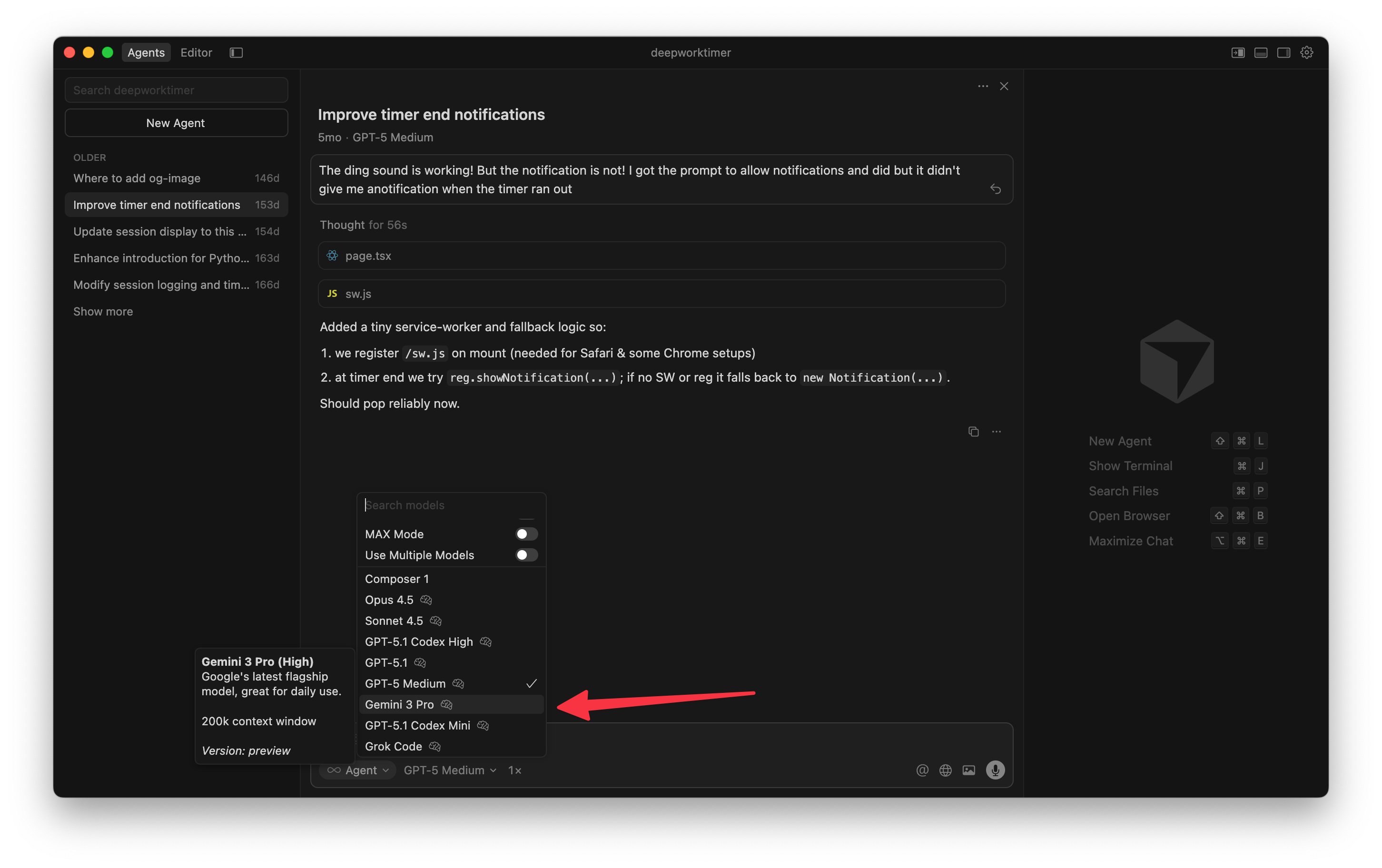 Second, and the one we’ll focus on, is via an AI-assisted IDE. I love using Cursor, and it has an option to select Gemini 3 Pro as the model.