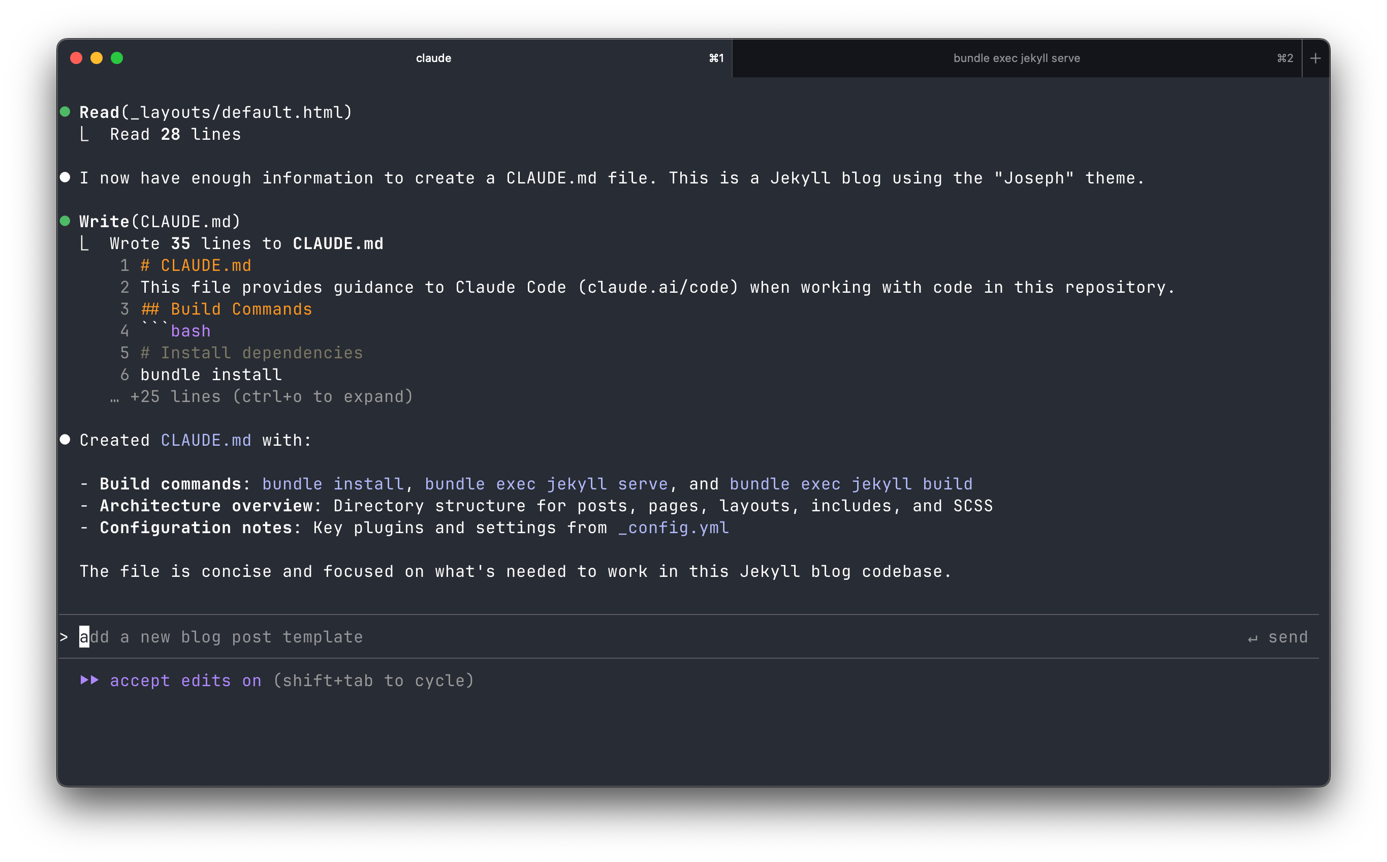 The first thing I’ll do is open Claude Code and use the /init command to spin off the agent to read and understand the codebase, documenting what it finds in CLAUDE.md.