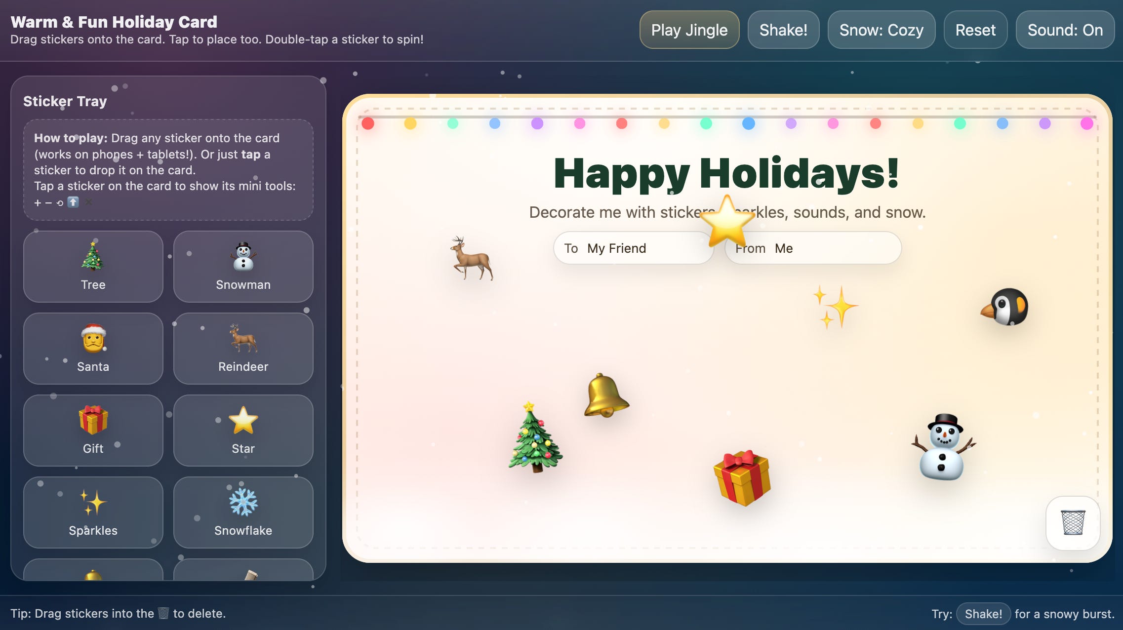 Create a single-page app, in a single HTML file, that demonstrates a warm and fun holiday card! The card should be interactive and enjoyable for kids!