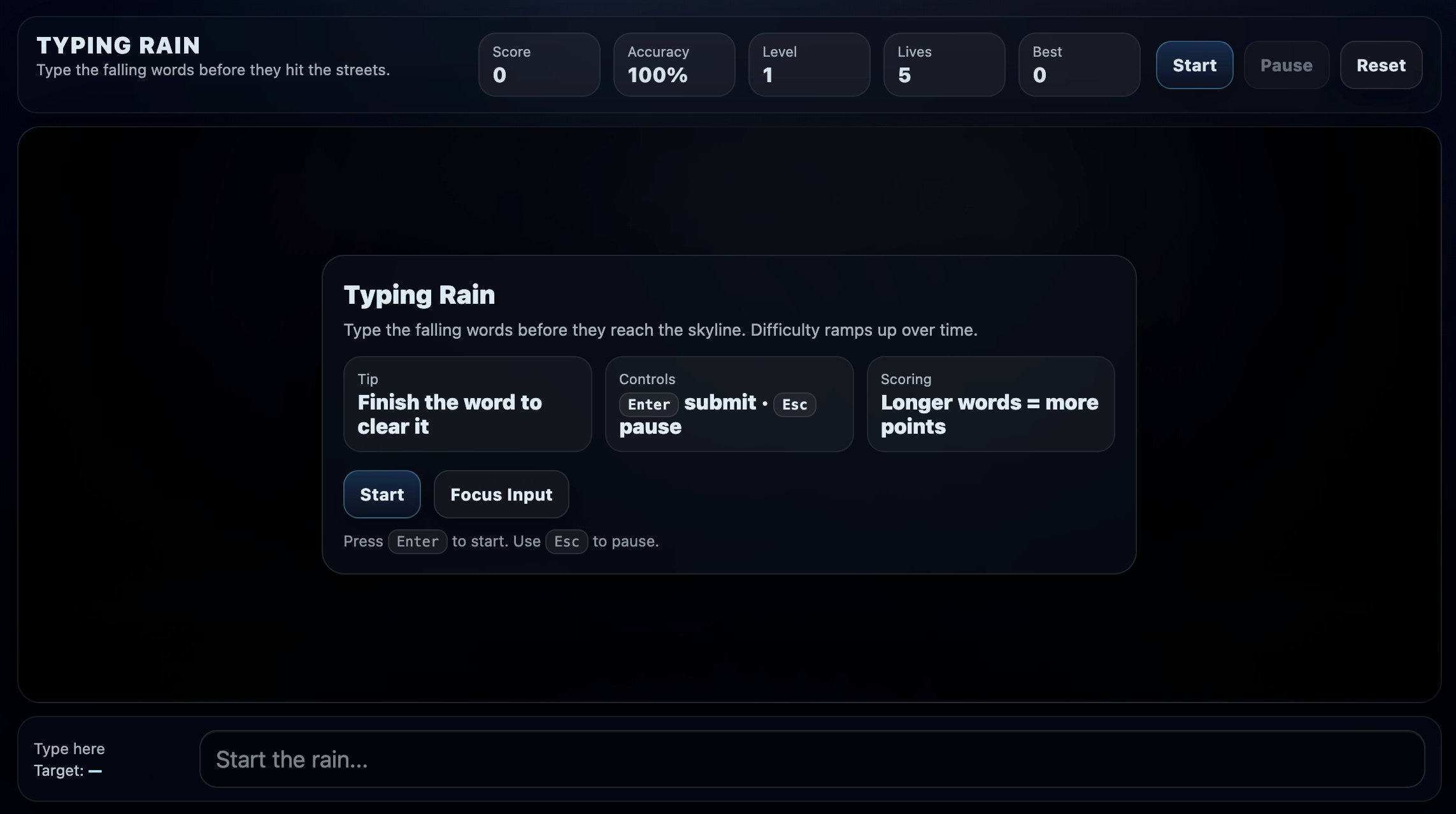 - Goal: Type falling words before they reach the bottom.