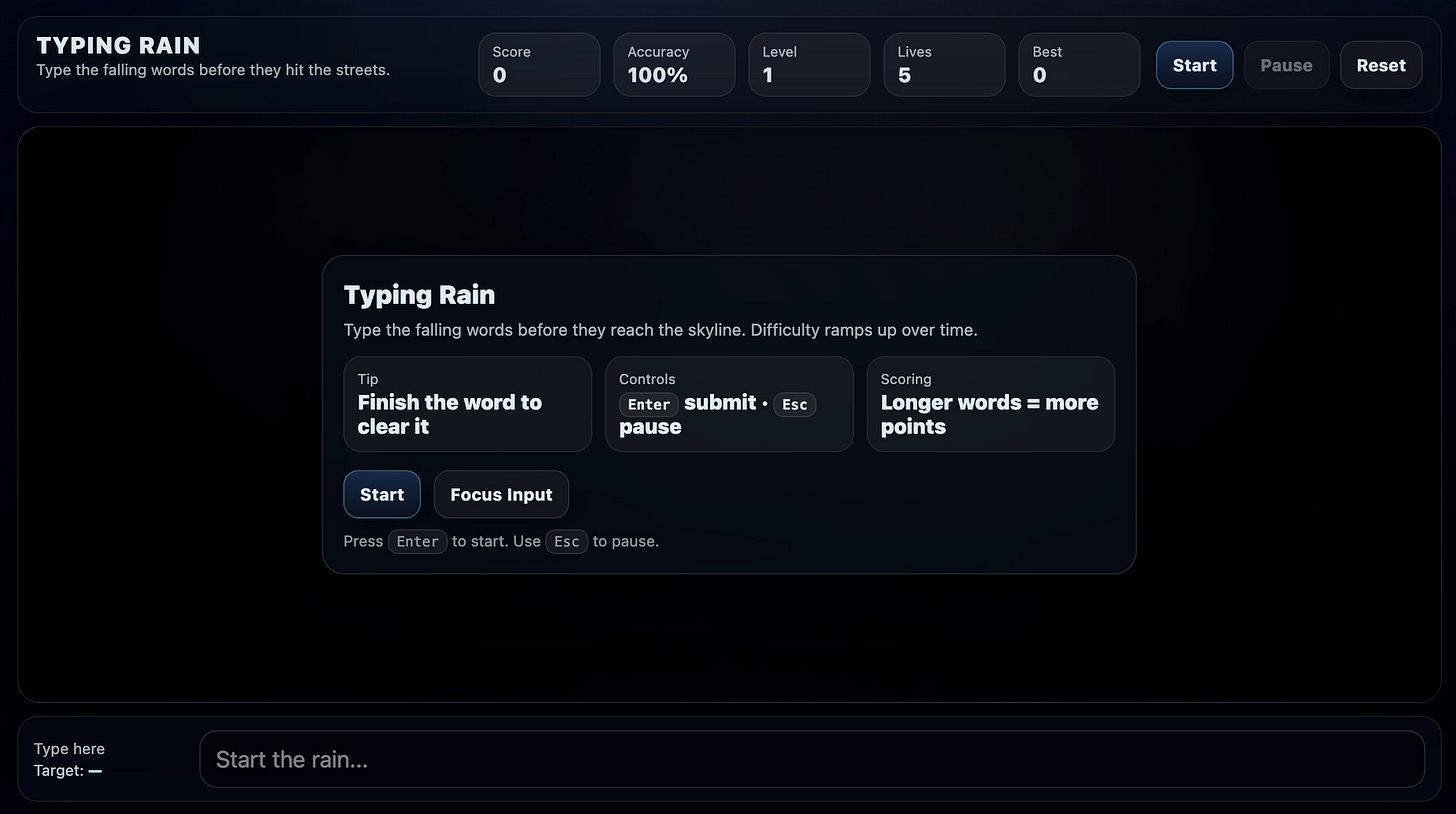 - The UI should be the city background with animated raindrop words.This is really cool, and reinforces that we’re entering the age of personal software, where you can build any low-medium complexity app incredibly fast, regardless of how small the commercial market is.