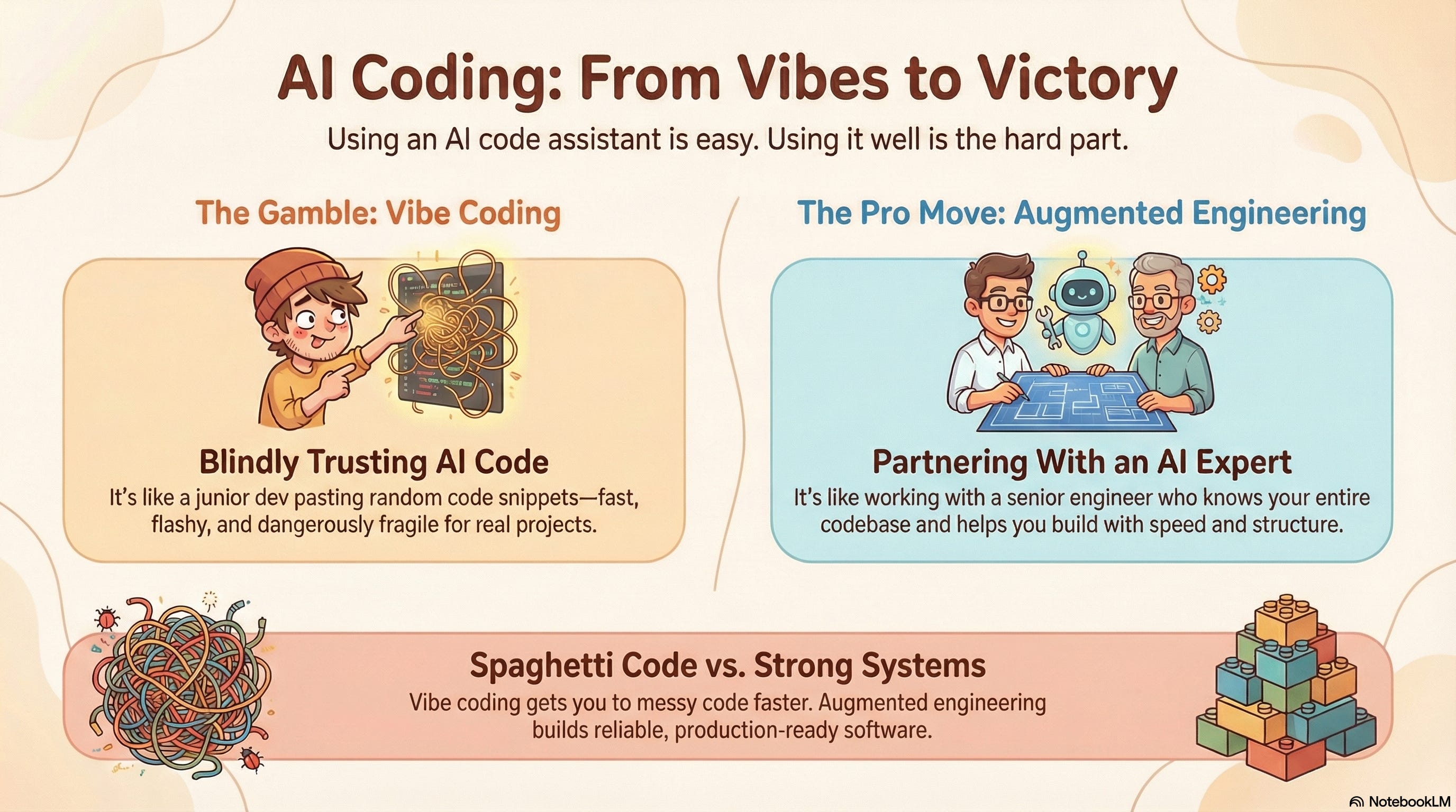 Think of vibe coding vs augmented engineering as the difference between a junior developer pasting random code from stack overflow and a staff engineer who has the full context of the codebase.