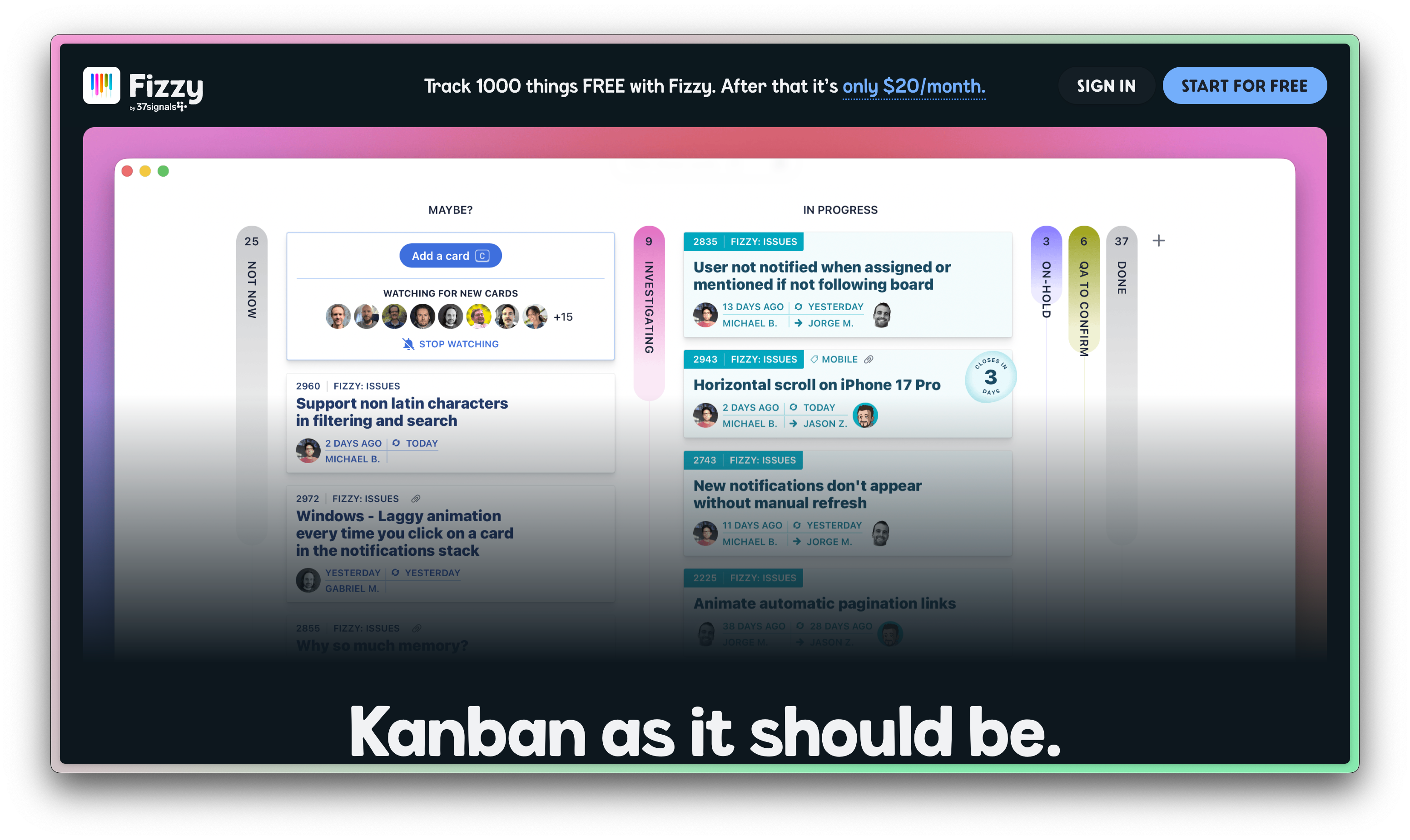 Fizzy is a collaborative Kanban-style project management and issue tracking application built by 37signals/Basecamp. Here’s a brief overview: